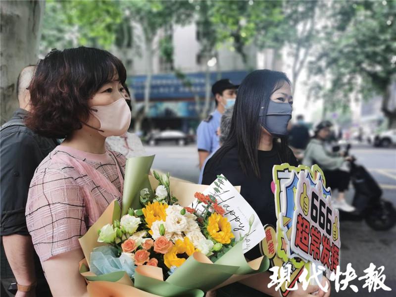 在金陵中学考点前,吴女士手捧鲜花为孩子送考。" 一大早,孩子的姑妈和姨妈一人订了一束鲜花送过来的。孩子爷爷奶奶也过来给他加油打气,希望他一切顺利。" 吴女士告诉现代快报记者,孩子就是金陵中学的学生,算是主场作战,没有太紧张。站在一旁的就是考生的姨妈,她提前制作了 "666 超常发挥 "" 高考加油 " 等加油标语。