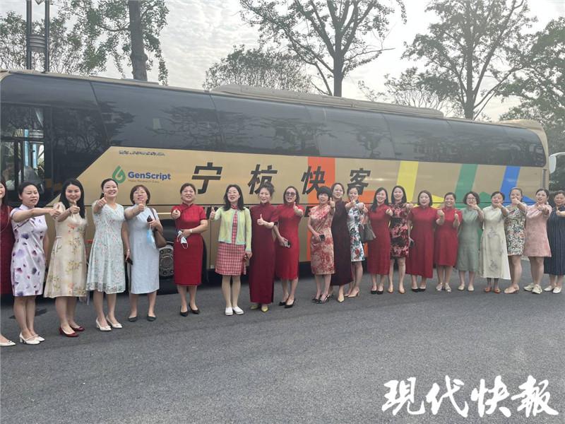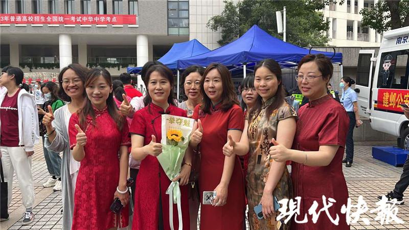 一大早的金陵中学河西分校内,身穿旗袍的妈妈们为考生高考加油。金陵中学河西分校组织了 9 辆大巴车,护送 340 名考生前往南京市中华中学考点。