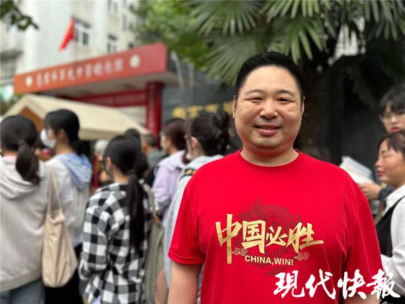 何俊先生的孩子就读于金陵中学集团人民中学,今天父子二人都穿着红色 T 恤。孩子进入考场,何俊接受记者采访时说,最近这个阶段,孩子特别辛苦,他也很心疼。" 今天早上,我们也一直给孩子减压,希望孩子放轻松,会做的题就做,不会的就放一放。" 何俊说,红色也有红红火火的寓意,希望孩子和所有的考生都能加油。