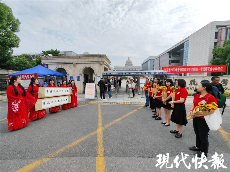 现代快报讯 2023 年高考 6 月 7 日开考。江苏 44.5 万名考生报名参加高考,南京共有 29797 名考生参加考场编排。一大早,在各个考点外,老师和家长,还有学弟学妹们就送上了各具特色的温暖祝福,祝福考生们旗开得胜。来自各界的有力后勤保障,也让考生们能安心走进考场,因为全社会都是他们奔赴理想的最强后援。