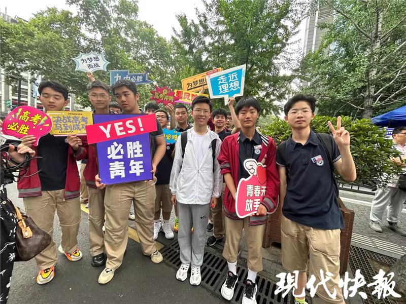 在南京九中考点门口,九中高一年级的学生自发组织起来,给高三的学长和学姐加油!高考必胜、九中必胜、乘风破浪、高考冲鸭、必胜青年、青春无悔放手一搏、走近理想、为梦想而战、马到成功 …… 这些应援牌是九中门口最靓丽的风景线。高一(4)班陆浚哲说,入学时,他们就知道学校有很多传统,给学长学姐送考就是其中之一。早上 7 点,高一各个班组织人员来到现场。陆浚哲说:" 希望他们能够九天揽月,考上自己理想的大学。"