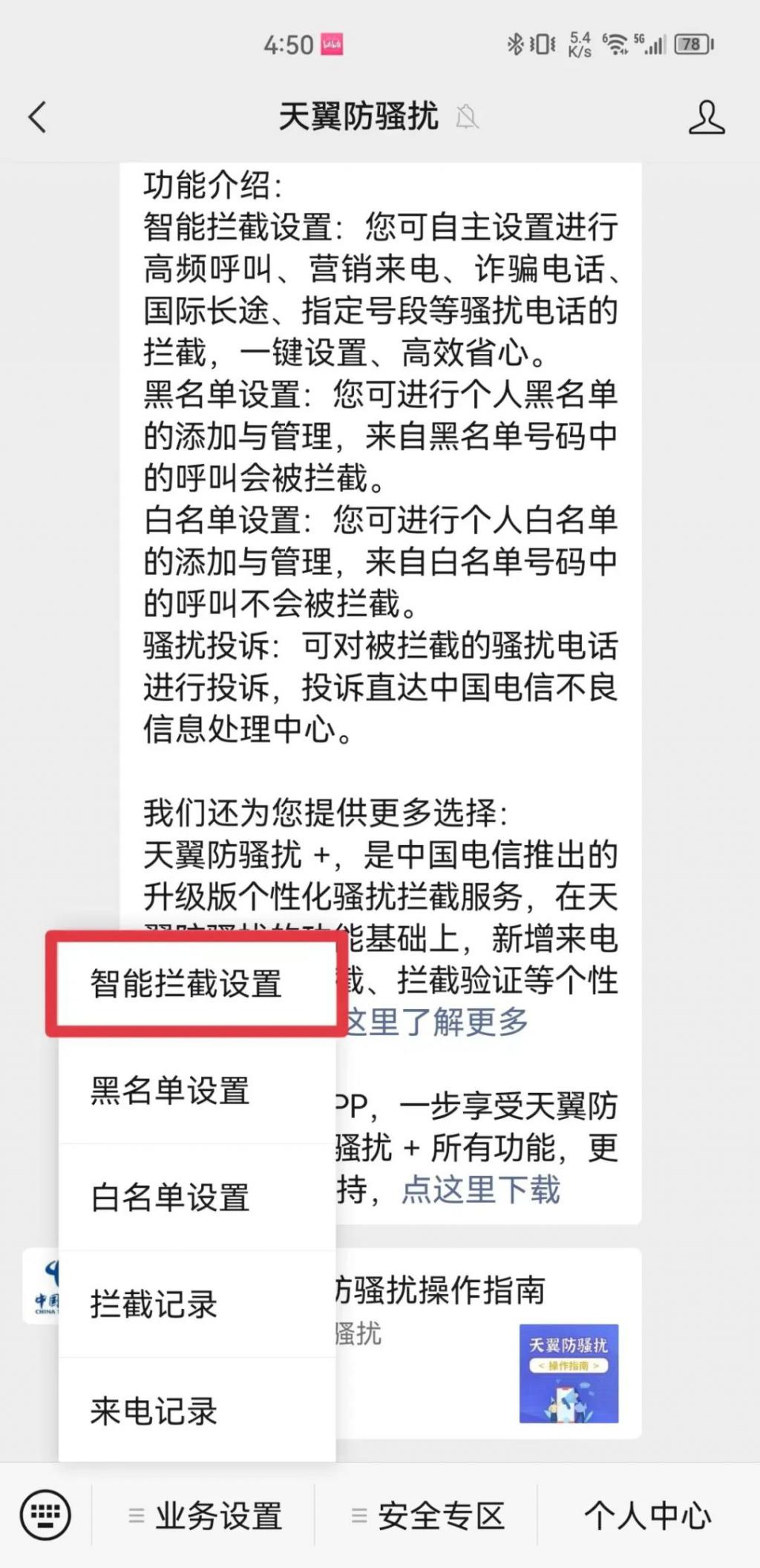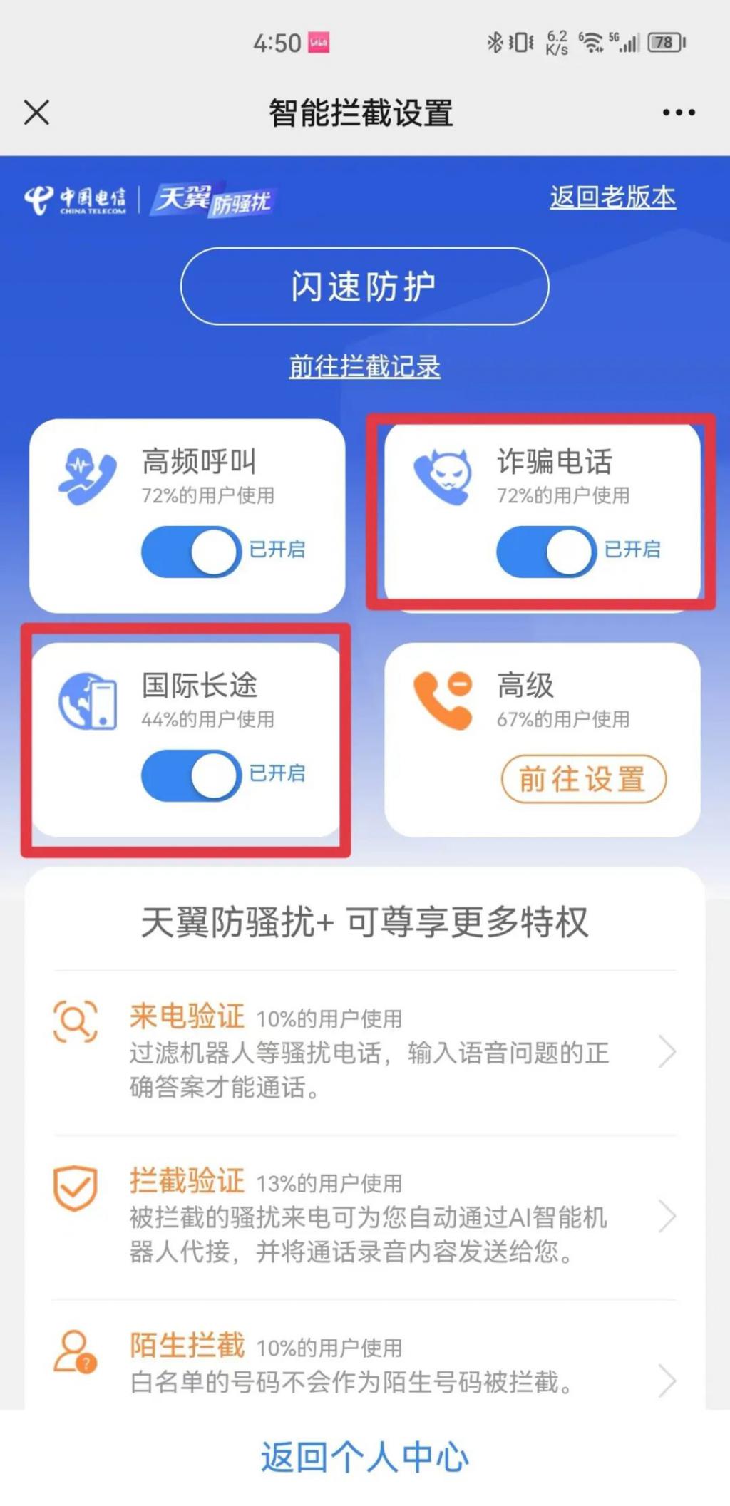 2. 电信用户:拨打 10000 转人工服务开启国际长途拦截,或关注 " 天翼防骚扰 " 微信公众号→业务设置→智能拦截设置→本机号码一键登陆→立即开通→开通成功→立即体验→智能拦截→开启国际长途拦截→收到【天翼防骚扰服务提醒】短信。