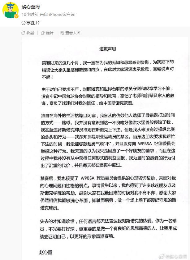赵心童坦言由于对自己要求不严," 辜负了球迷们对我的信任,给中国斯诺克蒙羞 "," 在此对大家深深表示歉意,真诚说声对不起 "。他最后表示,失去才懂得珍惜," 让我用成绩去证明自己,以更好的形象重返赛场 "。