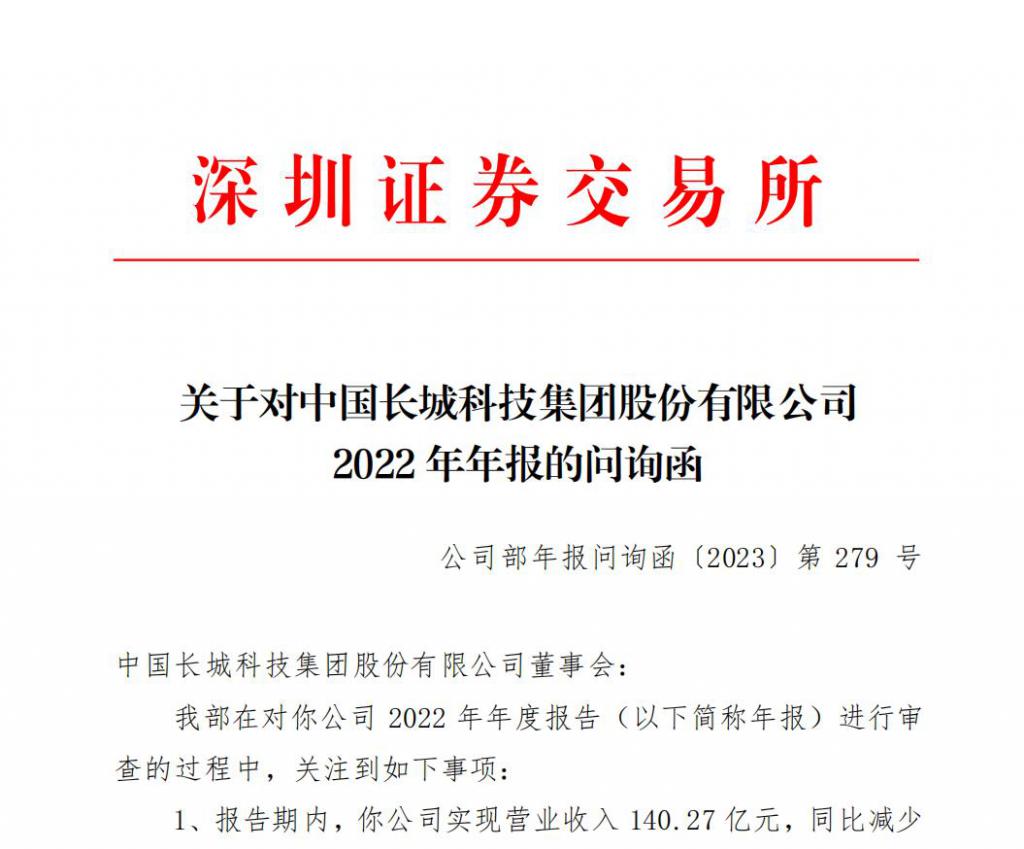 年报问询函显示,报告期内,中国长城公司实现营业收入 140.27 亿元,同比减少 21.15%;实现归属于上市公司股东的扣除非经常性损益的净利润 ( 以下简称扣非后净利润 ) 1128.7 万元,同比减少 91.47%。