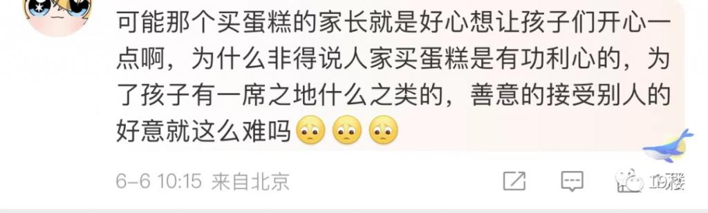 但是也有网友表示,被点名指责的家长也很委屈,买蛋糕未见得就是有功利心,为什么不能好好接受他人的善意?