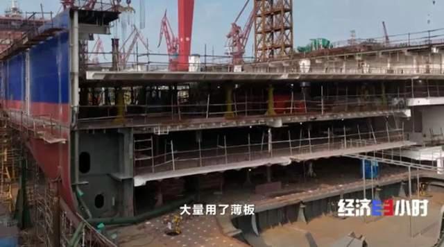 建造这艘汽车滚装船所采用的钢板只有 6 毫米,厚度不到五角硬币直径的三分之一,而一辆小轿车的重量都超过一吨。同时,汽车运输船为了方便汽车行驶,舱内采用立柱结构,缺少 " 承重墙 ",这就对甲板的稳定性提出苛刻的要求。