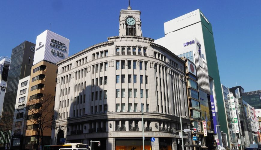 和光百货的建筑物外观就像是银座的象征一般,特别是顶端的钟塔。和光百货的前身是发迹于1881年的服部钟表店,历史相当悠久,目前也以贩售SEIKO的钟表为主,以及众多国际品牌的精品!最大的特征是在营业时间内的每个整点时刻,顶楼的钟塔会响起西敏寺钟声来报时,下次来到这里逛街时不妨也能留意一下唷!