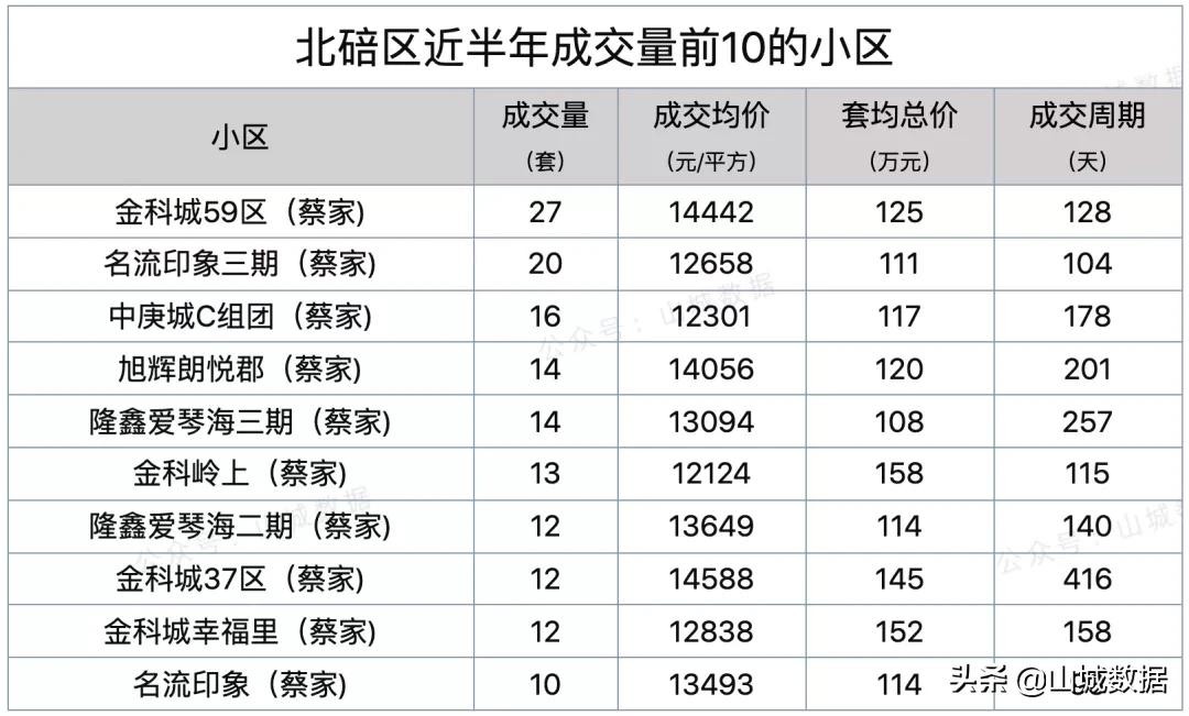 成交量前10的小区全部位于蔡家板块,单价1.2到1.4万/平方,套均总价均大约100万。