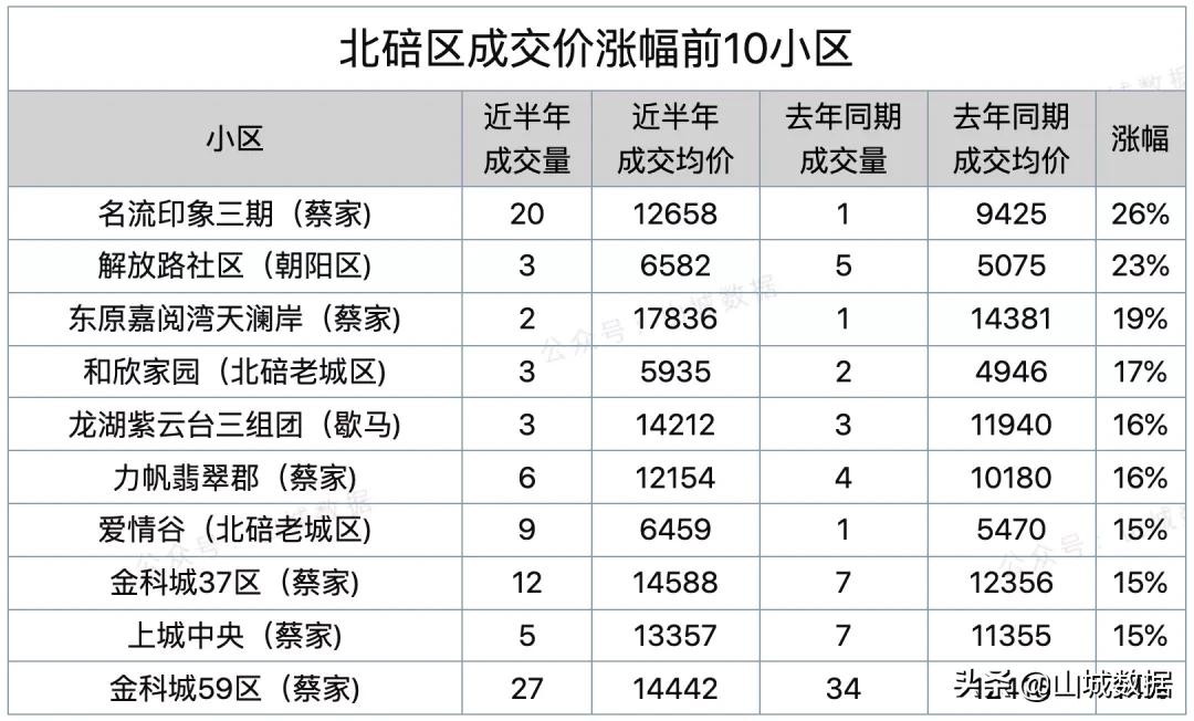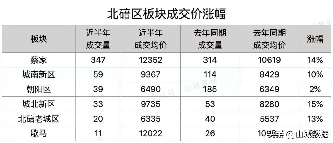 北碚老城区近半年成交均价6335元/平方,为各板块最低,但相比去年,仍然有13%的涨幅。