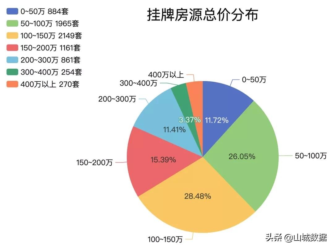 总价100到150万的房源占比28.5%最多,其次为总价50到100万的房源,占比26%。