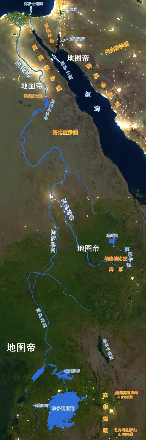 尼罗河全长6670公里,是世界上最长的河流。尼罗河有两个源头,一是发源于埃塞俄比亚高原的青尼罗河,一是发源于中非维多利亚湖的白尼罗河。青尼罗河与白尼罗河在苏丹首都喀土穆会合,形成了巨大的尼罗河,一路向北流去,在埃及北部汇入地中海。
