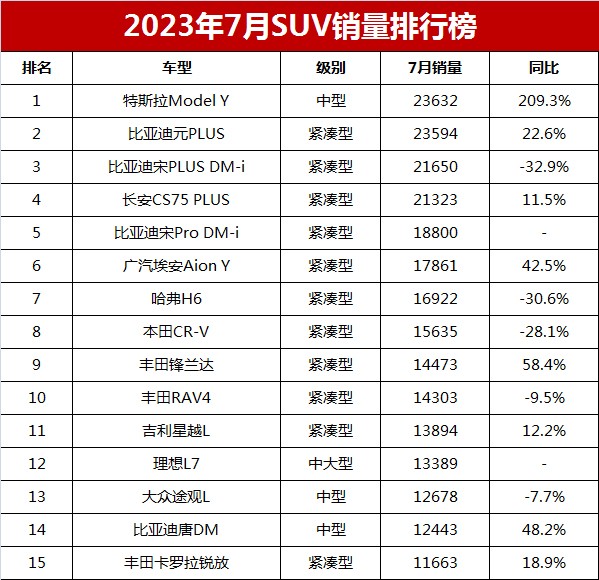 7月SUV销量排行榜完整版,特斯拉惊险夺冠,比亚迪屈居第二