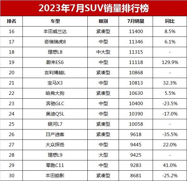吉利星越L、理想L7、大众途观L、比亚迪唐DM和卡罗拉锐放排名第11至第15位。其中,星越L销量13894辆,是吉利旗下销量最好的车型,也是国产燃油SUV的“老三”;理想L7销量13389辆,排名第12位,蝉联中大型SUV销量冠军;大众途观L夺得7月中型SUV销量冠军,其销量为12678辆;比亚迪唐DM则是国产中型SUV销量冠军,7月销量12443辆,连续6个月销量破万辆。