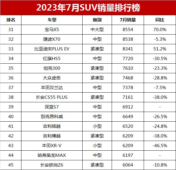 红旗HS5、坦克300、大众途岳、丰田汉兰达、长安CS55 PLUS等五款车型的销量均达到7000+辆的水平,排名第34至第38位,销量均低于去年同期。其中,丰田汉兰达销量7378辆,排名第37位,虽然低于去年同期,但依然是今年销量最高的一个月份。