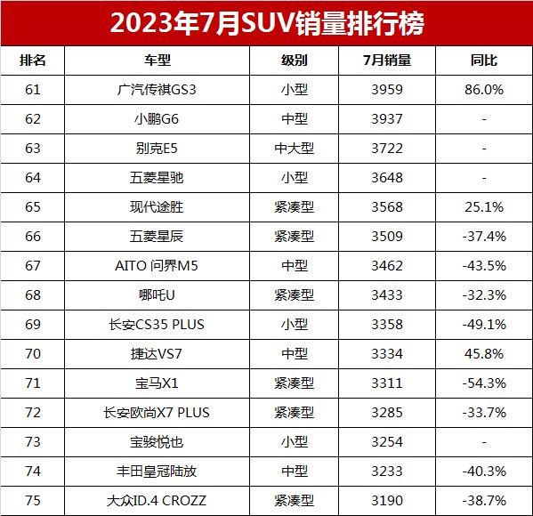 全新小鹏G6上市第二个月销量3937辆,排名第62位。全新别克E5销量也保持增长,7月销量3722辆,成为除了特斯拉外销量最好的合资新能源SUV车型。