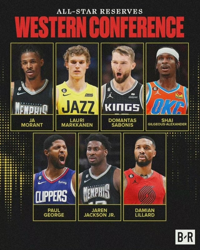 西部替补:亚历山大(雷霆)、莫兰特(灰熊)、小萨博尼斯(国王)、保罗·乔治(快船)、小贾伦·杰克逊(灰熊)、利拉德(开拓者)、马尔卡宁(爵士)