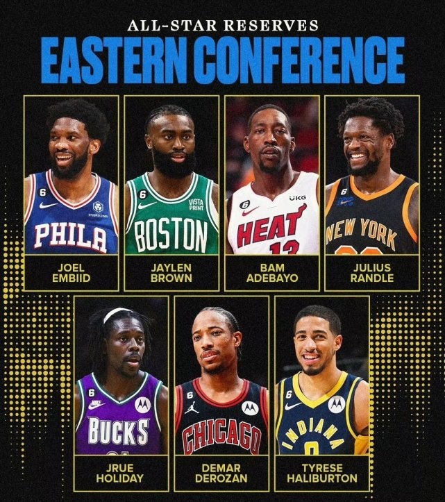 东部替补:恩比德(76人)、杰伦·布朗(凯尔特人)、阿德巴约(热火)、兰德尔(尼克斯)、霍勒迪(雄鹿)、德罗赞(公牛)、哈利伯顿(步行者)