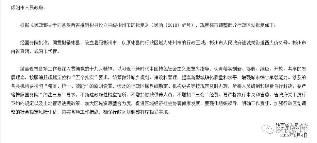 根据《民政部关于同意陕西省撤销彬县设立县级彬州市的批复》(民函〔2018〕47号),现就你市调整部分行政区划批复如下: