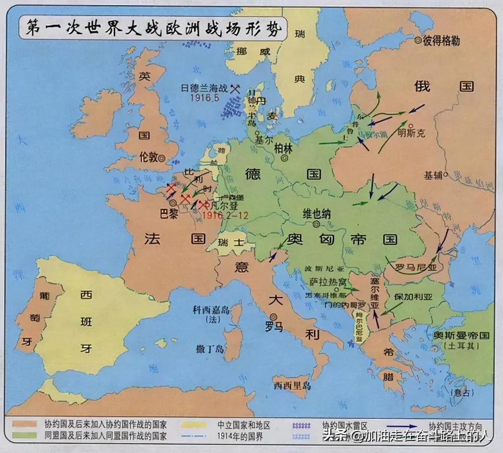 第一次世界大战发生于1914—1918年,主要战场在欧洲,但波及全世界。它是一场帝国主义国家间的争霸战,也是人类历史上一次空前的劫难,是作为毁灭之神降临人世的。战争主要在同盟国与协约国这两大军事集团之间进行,德国、奥匈帝国、土耳其、保加利亚等属同盟国阵营,英国、法国、俄国和意大利等则属协约国阵营,后来发展到共有33个国家、15亿人卷入这场真正意义上的全球性军事冲突之中。