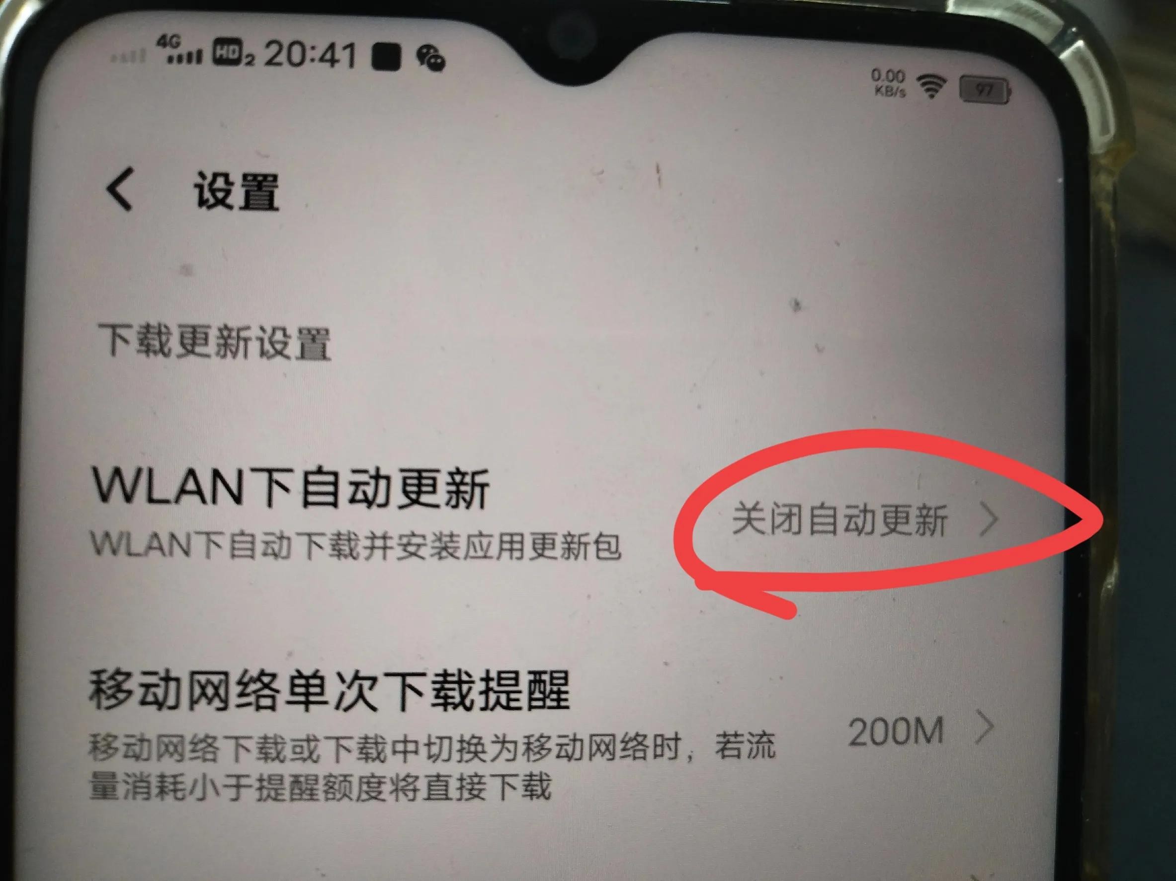 找到“WiFi 下自动更新”选项,一定要选择关闭。(如上图所示)