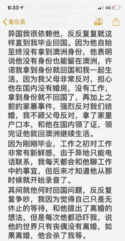 据张雨婷自述,自己在异国的时候,特别依赖男方,但是男方一直在欺骗自己,伪造了伪造澳洲绿卡身份和房产信息,给她买假的奢侈品。同时,还多次对其家暴。