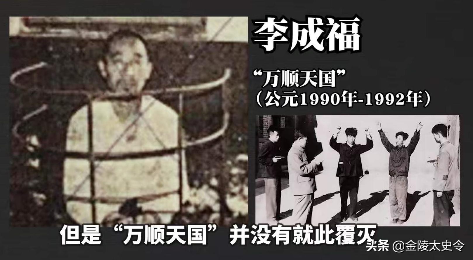 30多年前,在河南省洛阳市嵩县,有个名叫李成福的人,拥兵10多人,以大唐为模板,建立了一个封建帝制国家“万顺天国”,建国河南嵩县,定都陕西西安。这个“万顺天国”成员最终因为一次人口普查意外暴露,被当地3位民警一举歼灭,“万顺天国”彻底宣告灭亡。