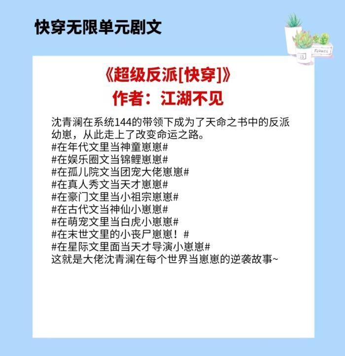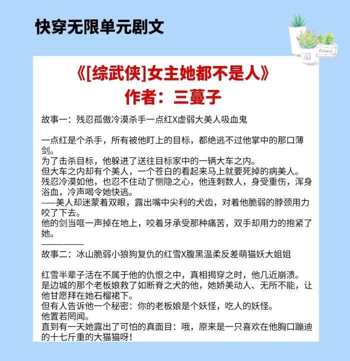 大家好,我是毛毛虫,本期分享4本快穿无限单元剧文,强推《四院病友交流论坛》,女主骚操作不断