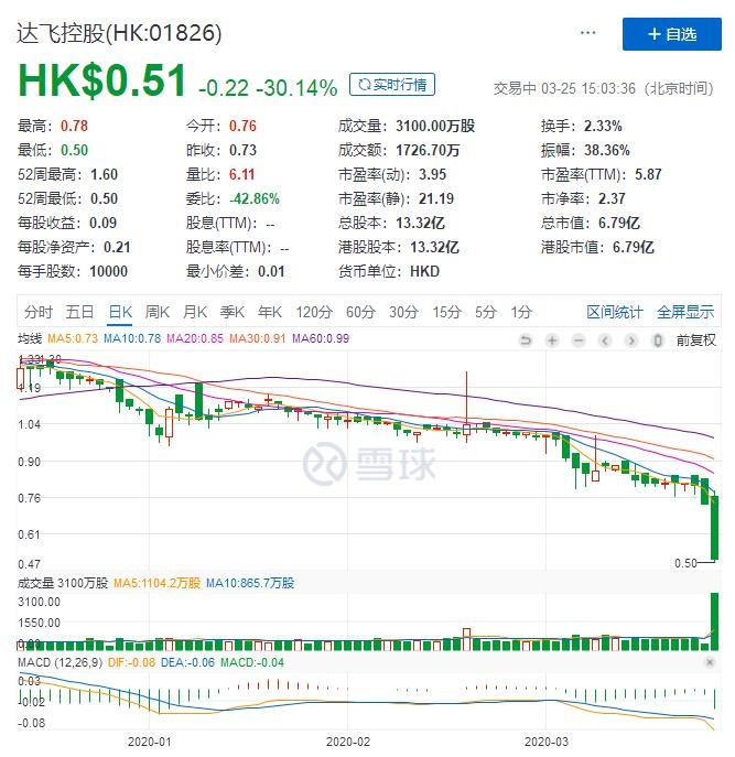 高云红旗下的港股上市公司达飞控股(01826.HK)今日暴跌30%。