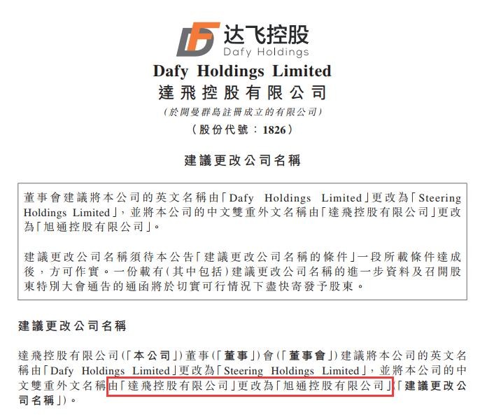 今年3月20日,达飞控股发布公告称公司名字将由达飞控股有限公司改为旭通控股有限公司。