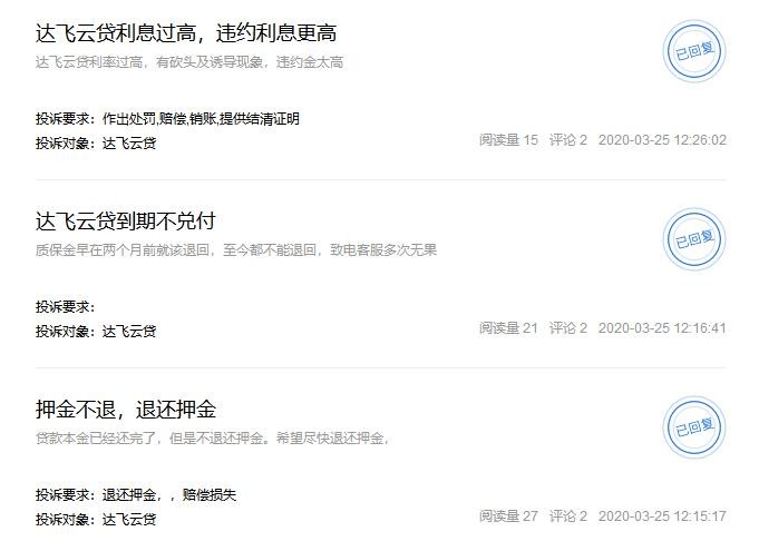 在聚投诉网站上,针对达飞云贷的投诉超过3000条,既有达飞云贷不兑付本金的,也有投诉达飞云贷利息过高。