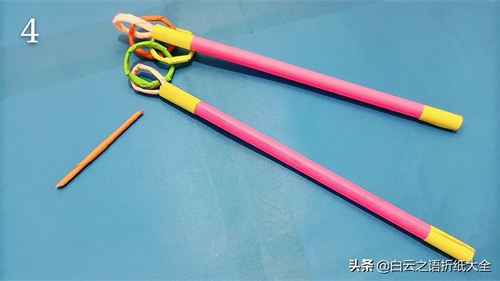 步骤2:我们用纸把吸管卷成一根小棍子,并且在棍子的两端分别贴上黄色宽度为1.5cm的纸。