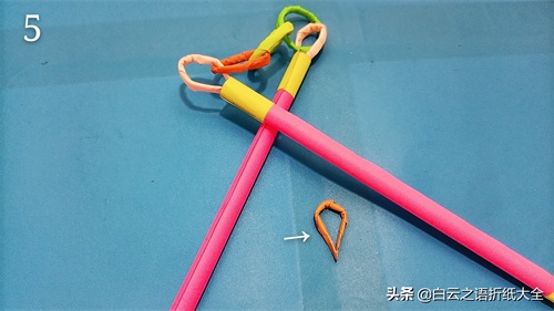 步骤6:我们要折出2个水滴状,分别插入两根棍子的顶部,然后用胶水固定好。