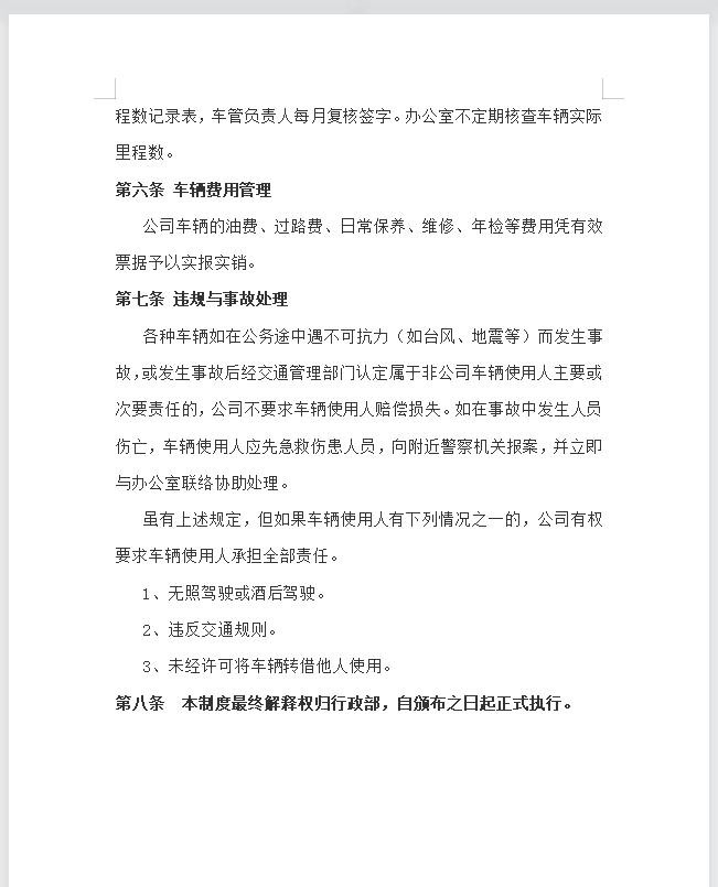 5、车辆使用人应妥善保管公司车辆,确保车辆安全,保持车辆的内外整洁,晚间车辆应存放正规存车场,否则车辆出现遗失、损坏情况,由车辆使用人负责赔偿。