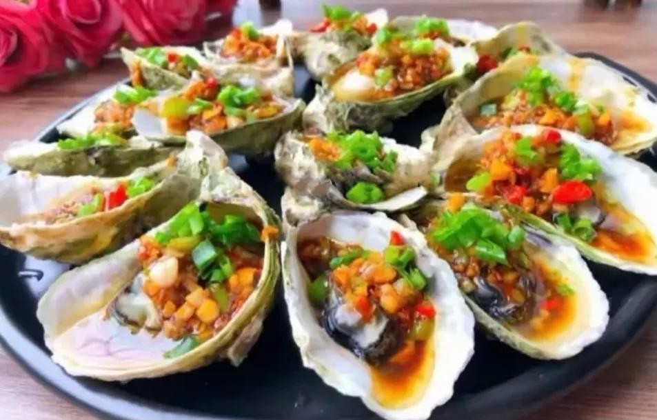 (4)把蒸好的海蛎取出来,掰掉一半的海蛎壳,留一半把海蛎整齐的摆在盘里,浇上炒好的蒜蓉辣椒撒上葱花点缀即可,营养又美味特别好吃全家人都喜欢吃!