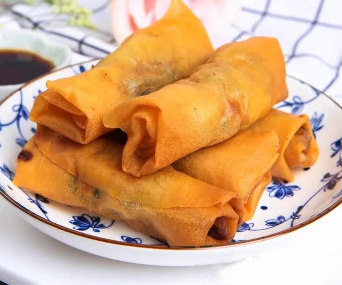 (3)锅中热油放入包好的春卷,中火炸至底部金黄时候翻一下面,炸至两面呈金黄捞出即可,年夜饭必备的一道美食炸春卷小孩子老人都喜欢吃!