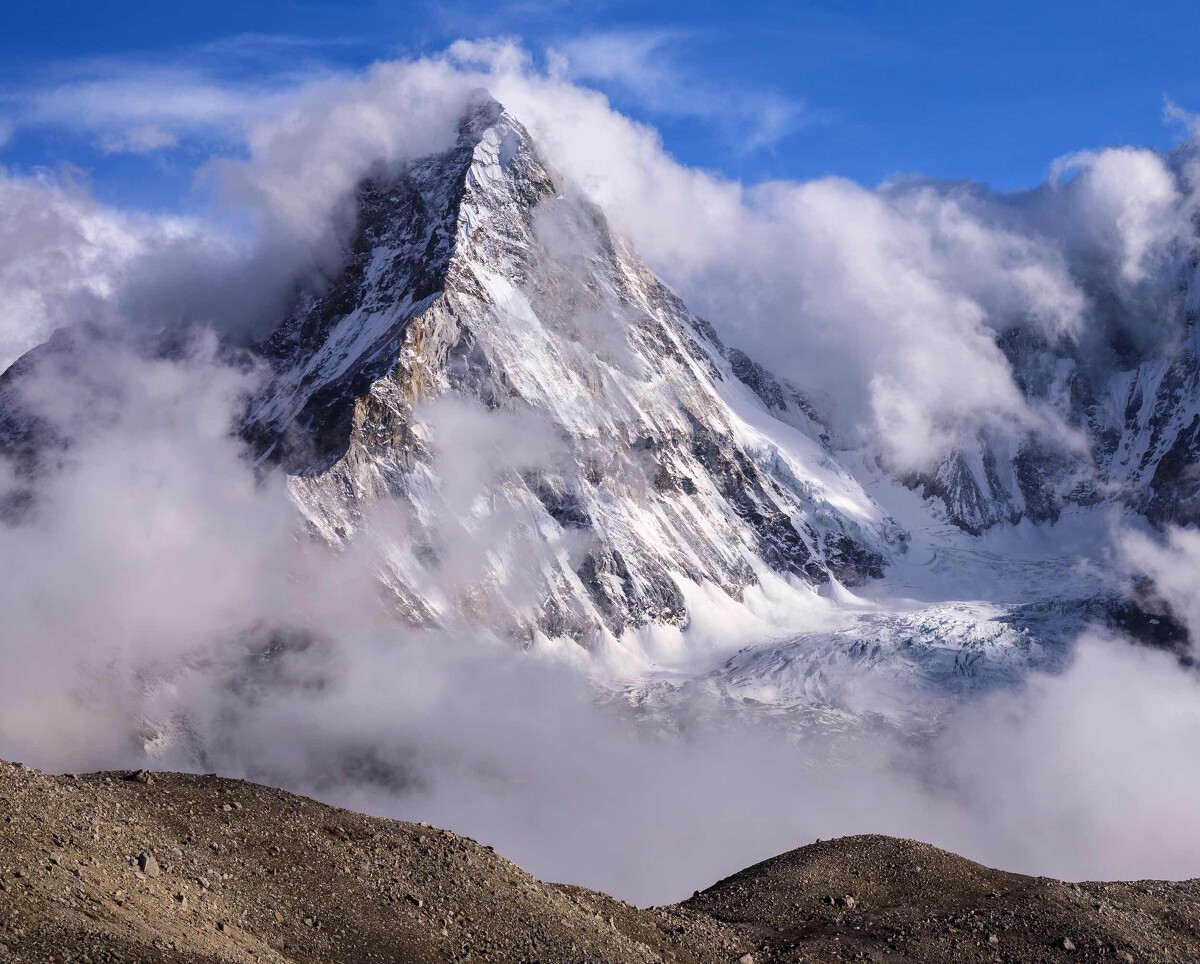 喀拉昆达姆峰在尼泊尔一侧展现出其雄峰的威严,高耸入云,巍然屹立,成为喜马拉雅山脉中的独特存在。