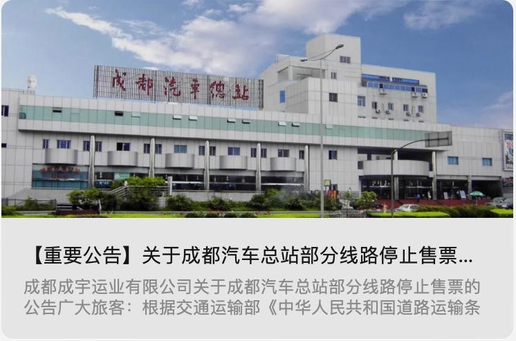 5月23日,一则《关于成都汽车总站部分线路停止售票的公告》出现在互联网上,自6月1日起从成都汽车总站开往各地的客运线路将陆续停止售票。