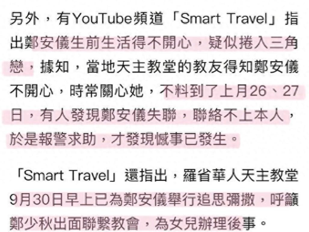 据美国教会称,郑安仪在9月26日之后就失去了联系,也有可能在此之前就已经自杀,如果不是教会出面,恐怕到现在都没人发现郑安仪已经去世。
