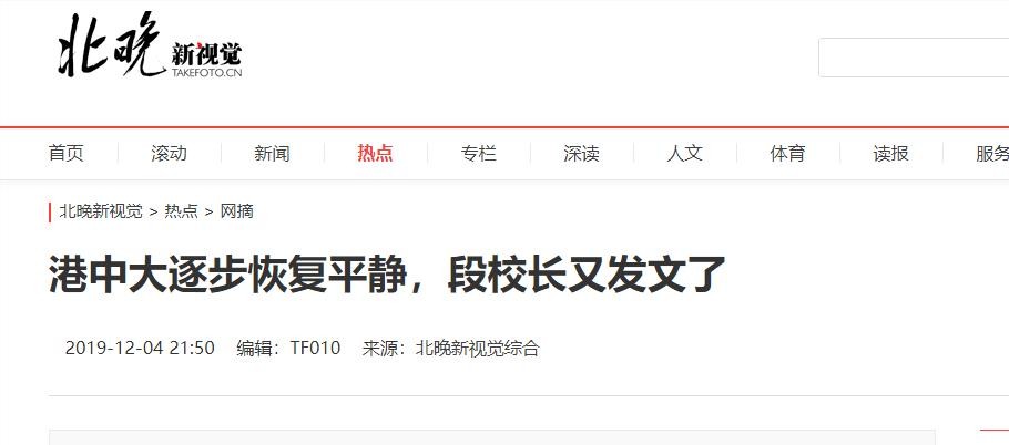 港中大逐步恢复平静,段校长又发文了 2019-12-04 编辑:TF010 来源:北晚新视觉综合