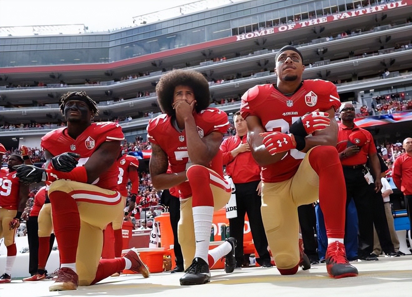 “当这个国家还在压迫黑人和其他有色人种,我就不会对这个国家的旗帜致敬。”2016年,橄榄球运动员科林.卡佩尼克的球员在当季进行的数场季前赛奏国歌时拒绝起立,并单膝而跪,以表达对当时美国各地接连发生的警察对黑人暴力执法行为的不满。