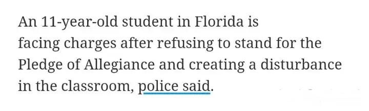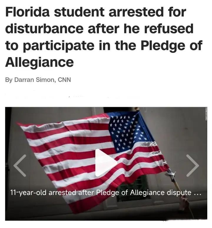 2019年,美国佛罗里达州一名11岁的学生,因拒绝参加效忠宣誓并扰乱课堂秩序,被当地警方抓捕并面临指控。