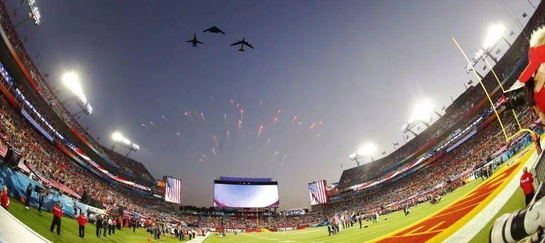 比如在每年全美收视率最高的电视节目、号称美国春晚的“超级碗”NFL(美国职业橄榄球大联盟年度冠军赛)的开幕式上,三架极具震撼力的美国B1B枪骑兵战略轰炸机、B52同温层堡垒战略轰炸机和B2隐身轰炸机从空中一掠而过,既是为比赛助兴,也是向美国老百姓彰显国家实力,进而增强他们身为美国人的自豪感。