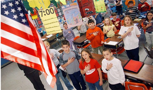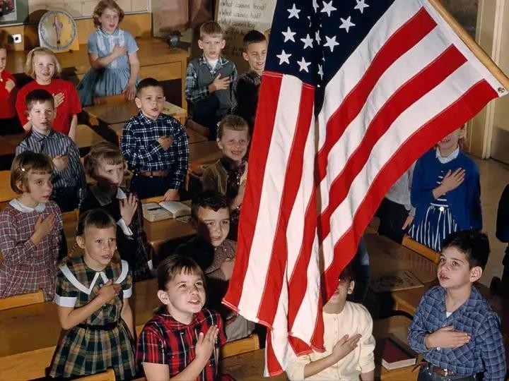 美国50个州里的47个州,全美98%的县,超过99%的学区都强制规定,只要是教学日,上课前的第一个环节必须为学生全体起立背诵"效忠宣誓"词,但是不需要升国旗,因为每个教室里的国旗压根不会降下来。