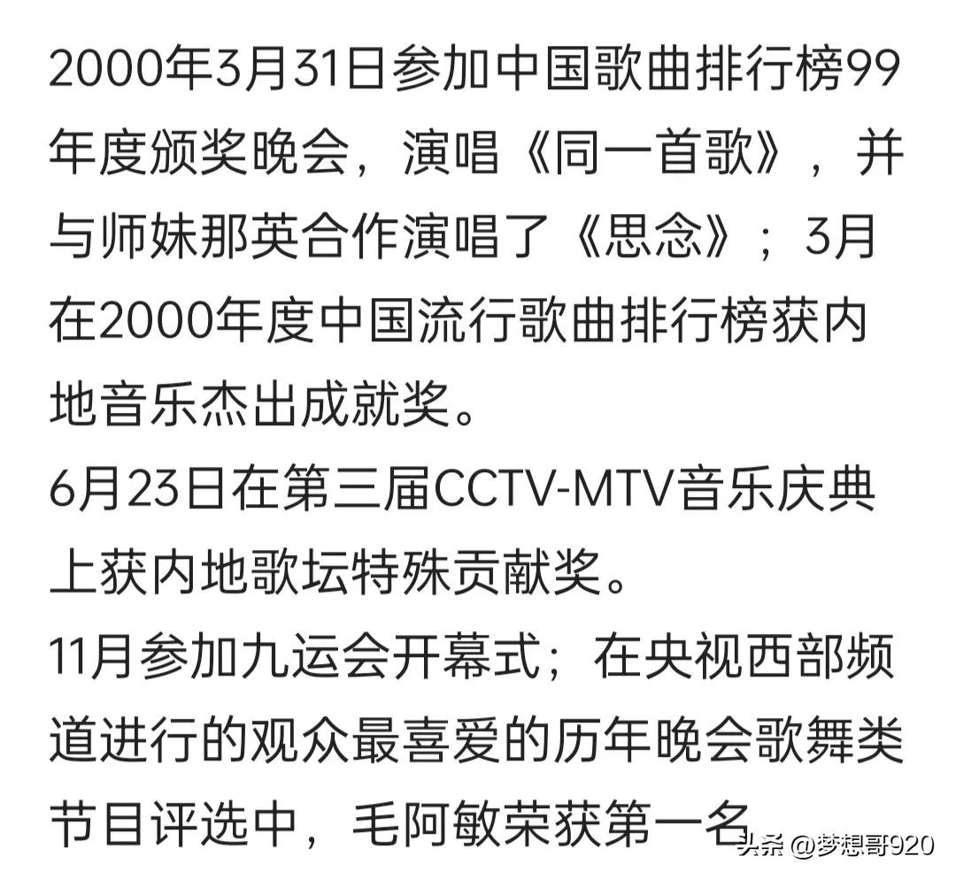 1988年,毛阿敏参加了央视春晚,其独唱歌曲《思念》迅速红遍大江南北。