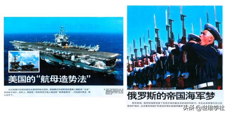 其实美国和俄罗斯的海军实力也很强。美国主要体现在航空母舰上,航空母舰的各种设施及其声势,会形成一种很大的打击力。这种打击力具体体现在以下几点:第一,航空母舰在海上就相当于一座长城或堡垒;第二,航空母舰在海上就是一个独立作战单位;第三,航空母舰的舰载战斗机通通可以航行,而且携带炸弹:第四,航空母舰会发射导弹:第五,航空母舰通常指挥着一个战斗群,它的四周配有驱逐舰、巡洋舰以及核潜艇,等等。最重要的是,航空母舰拥有吓阻力量。比如,美国“企业”号航空母舰是世界上第一艘核动力航空母舰,1962年就开到古巴那边去了。也就是说,这艘航空母舰已经服役了快半个世纪了,到现在还航行在太平洋和大西洋上。这艘航空母舰所属的美国第五舰队司令官声称,该航空母舰状况依然良好,可以胜任任何任务。而俄罗斯的海军也已经做好了准备,开始恢复在地中海和黑海的大规模军事演习,要实现其当初帝国海军的梦想。