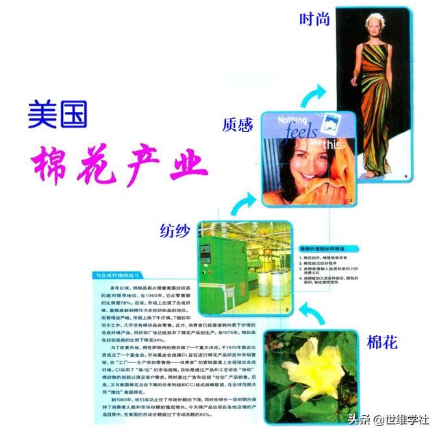 大部分国家和企业都只是将棉花纺成棉纱(棉花产业的第一阶段),然后再将棉纱制作成产品(棉花产业的第二阶段),而美国却已发展到第三阶段和第四阶段,即将棉的文化及其时尚品位做了出来,这一点非常难得。