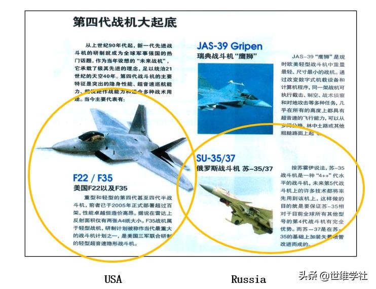 讲到空军和海军,人们一定会提到两个国家——美国和俄罗斯。美国研制出来的最新战斗机是第四代和四代半的,其中F22是第四代战斗机,F35是四代半战斗机。你认为战斗机最重要的实力是什么?第一个是速度快,F22是超音速巡航,所以它的速度非常快;第二个是隐形,目前美国的战斗机全部是隐形的,而这也是由它的高速度决定的。据说在飞行的时候,F22在雷达网上反射的面积仅有两张A4纸大小。两张A4的纸在35公里以外来看,几乎什么也看不见,所以它几乎是隐形的。俄罗斯也不示弱,他们研制的苏-35,速度也非常快,在隐形技术上也做得很好,而且在空中的回转和拦截技术都是一流的。所以,讲到世界上硬实力最强的战斗机,大家一定会提美国和俄罗斯研制的战斗机。