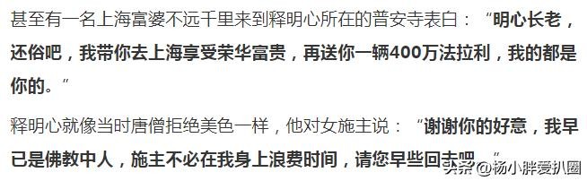 值得一提的是,其中有一位来自上海的富婆,还曾公开对释明心求婚,富婆家境优越,家中还有企业足以养活一个男人,她打算送一辆价值4百万左右的豪车给释明心,以此打动对方的心。