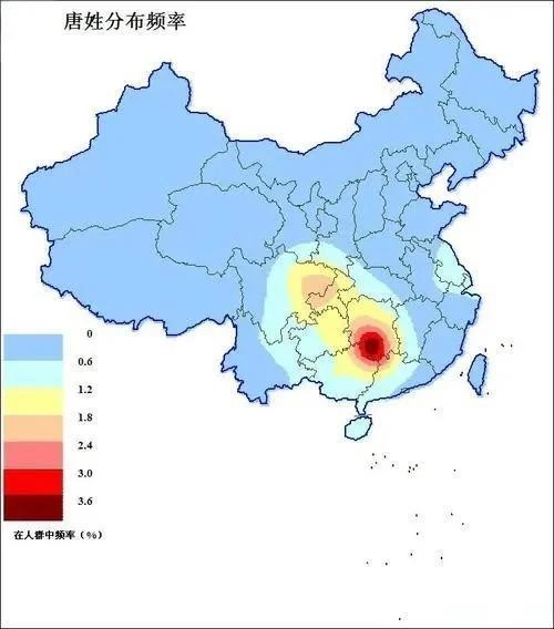 分布特点:在湘桂渝、云川东部、广东北部、江西西端、湖北西南等地区分布比例较高,这些地区唐姓人口占当地人口比例在1.14%以上,中心地区可达3%以上。