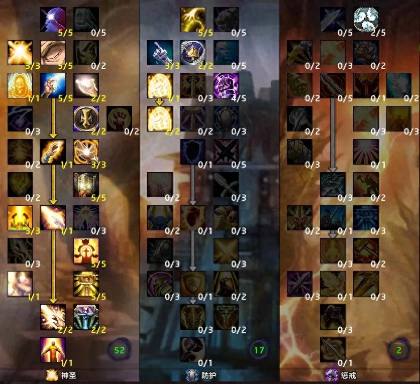 神圣系的天赋基本没什么争议,防护系中为了要点出神圣牺牲和神圣守护者,过路的点数可以修改修改,这里其实推荐点到护甲上去,但是也可以点到正义之怒上,因为可能会有一些场景可能用到。